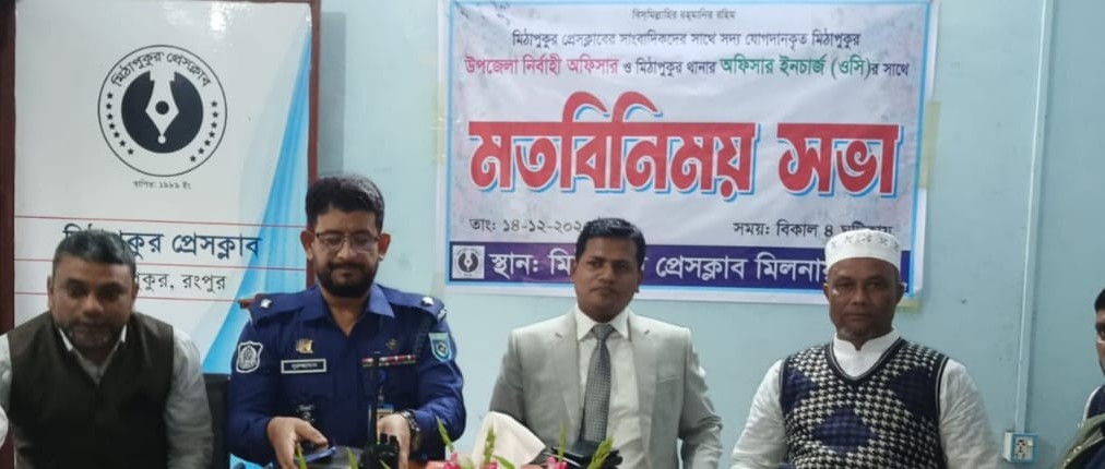 বিকেল ৪ টায় মিঠাপুকুর প্রেসক্লাব হলরুমে এই মতবিনিময় সভায় নবাগত ইউএনও পারভেজ বলেন, সাংবাদিকরা জাতীর বিবেক। মিঠাপুকুরে যেকোনো ঘটনা সম্পর্কে আমাকে অবগত করবেন। আমি চেষ্টা করব। আপনাদের সবার সহযোগিতায় আমরা স্বপ্নের মিঠাপুকুর গড়ব।