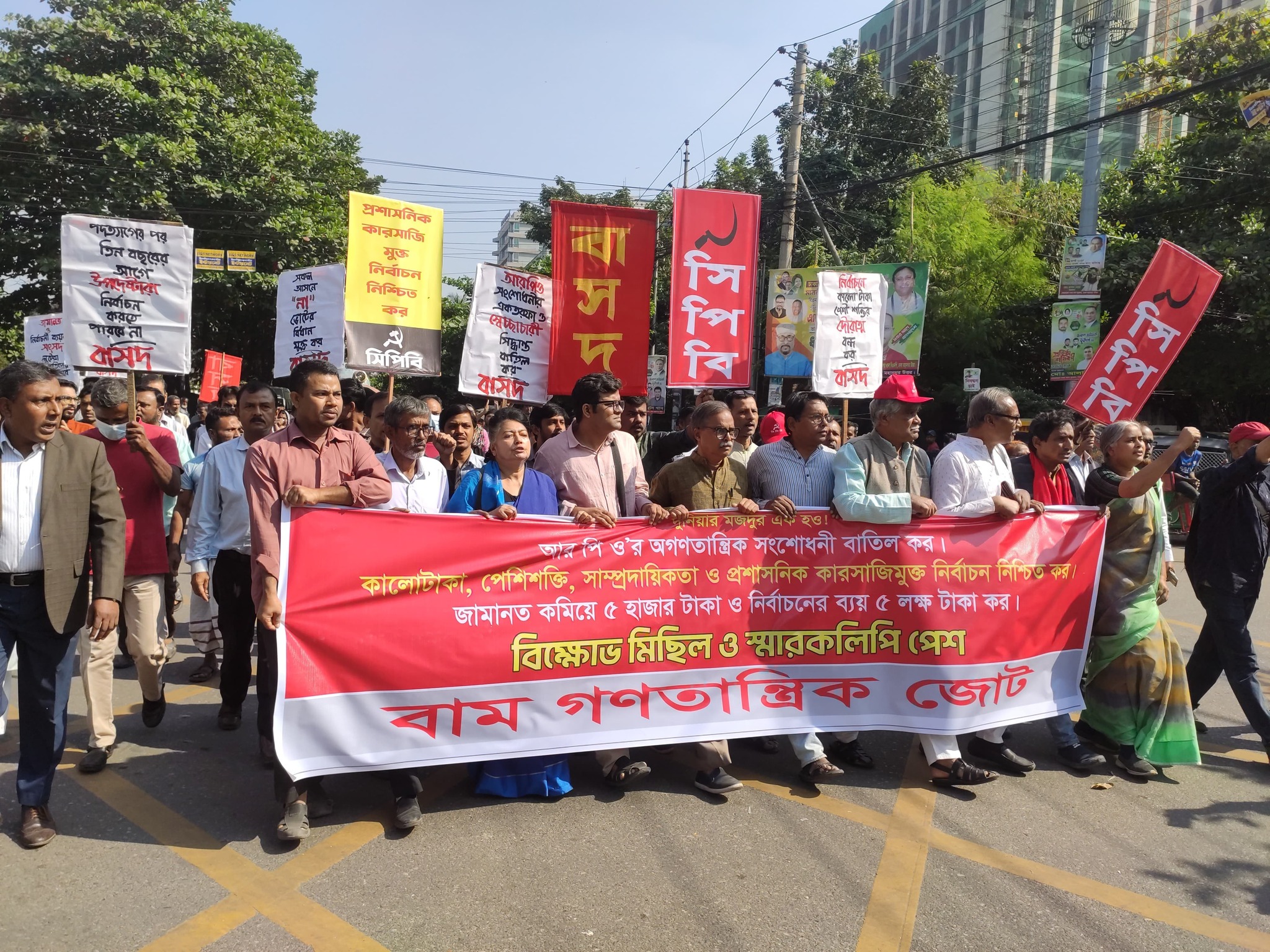 বাম গণতান্ত্রিক জোটের উদ্যোগে আজ ২৬শে নভেম্বর ২০২৫ সুষ্ঠ গ্রহণযোগ্য নির্বাচনের জন্য এবং সকলের জন্য নির্বাচনে সমান সুযোগ সুনিশ্চিত করার দাবিতে সারাদেশে জেলায় জেলায় নির্বাচন কমিশনারের কার্যালয়ের সামনে বিক্ষোভ মিছিল ও স্মারকলিপি পেশ করা হয়। কেন্দ্রীয় কর্মসূচি হিসেবে ঢাকায় আগারগাওয়ে প্রধান নির্বাচন কমিশনারের অফিসের সামনে বিক্ষোভ ও প্রধান নির্বাচন কমিশনার বরাবর স্মারকলিপি পেশ করা হয়। বাম জোটের নেতা কর্মীরা আগারগাও মেট্রো স্টেশনে জমায়েত হয়ে মিছিল নিয়ে নির্বাচন কমিশন ভবনের সামনে যান। সেখানে পুলিশ তাদের বাঁধা দিলে নির্বাচন কমিশন ভবনের গেটে বাম জোটের সমন্বয়ক ও বাসদের সাধারণ সম্পাদক বজলুর রশীদ ফিরোজের সভাপতিত্বে অনুষ্ঠিত সমাবেশে বক্তব্য রাখেন বাংলাদেশের কমিউনিস্ট পার্টির সাধারণ সম্পাদক আবদুল্লাহ ক্বাফি রতন, গণতান্ত্রিক বিপ্লবী পার্টির সাধারণ সম্পাদক মোশরেফা মিশু, বিপ্লবী কমিউনিস্ট লীগের সাধারণ সম্পাদক ইকবাল কবির জাহিদ, বাসদ (মার্কসবাদী) সমন্বয়ক মাসুদ রানা এবং বাংলাদেশের সমাজতান্ত্রিক পার্টির নির্বাহী সভাপতি আব্দুল আলী। সমাবেশ পরিচালনা করেন বাসদ নেতা খালেকুজ্জামান লিপন।