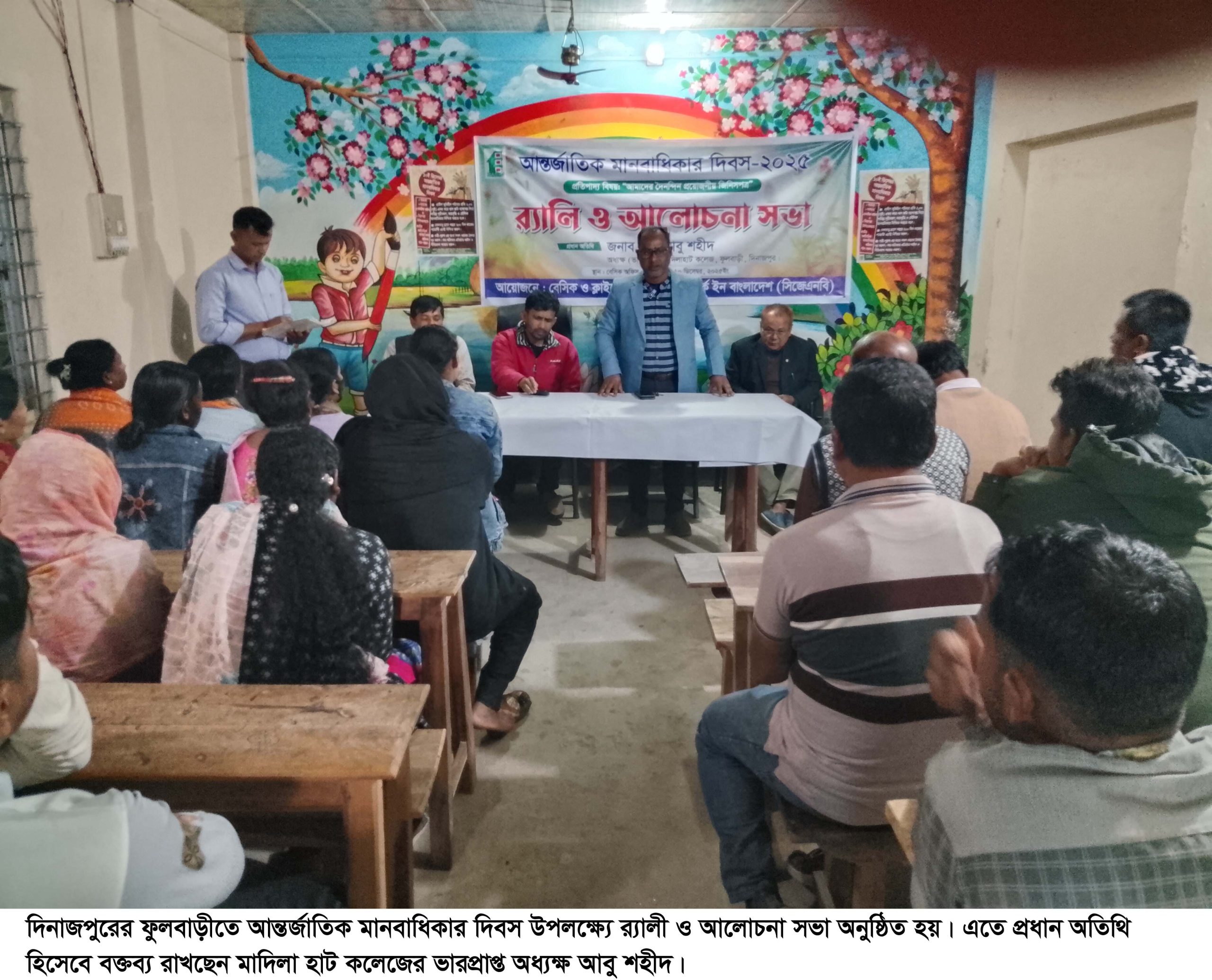 দিনাজপুরের ফুলবাড়ীতে আন্তর্জাতিক মানবাধিকার দিবস পালনে র্যালি ও আলোচনা সভা অনুষ্ঠিত। আজ ১০ই ডিসেম্বর বুধবার দুপুর ১২টায় ফুলবাড়ী বেসিক এনজিও সংস্থার নিবাহী পরিচালক শ্যামল চন্দ্র সরকার এর নেতিৃত্বে এক র্যালি বের হয়। র্যালি শেষে বেসিক কার্যালয়ে গিয়ে শেষ হয়। আন্তর্জাতিক বানবাধিকার দিবস পালনে সভাপতিত্ব করেন বেসিকের নির্বাহি পরিচালক শ্যামল চন্দ্র সরকার। এতে প্রাধান