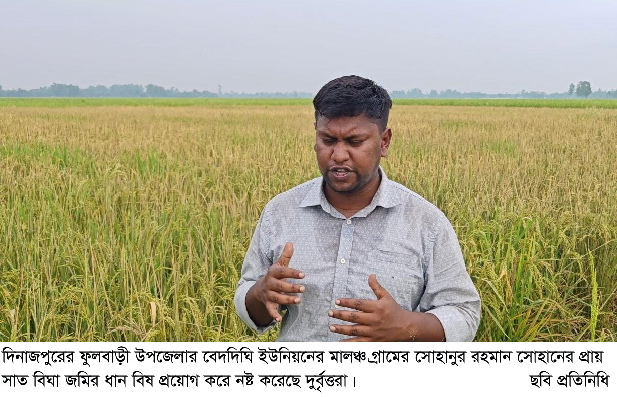 সোহানের প্রায় সাত বিঘা জমির ধান বিষ প্রয়োগ করে নষ্ট করেছে দুর্বৃত্তরা।