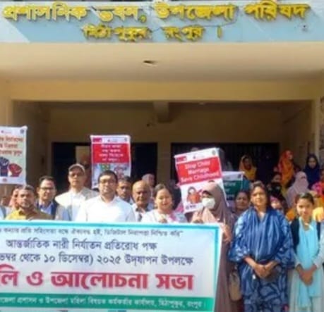ওয়ার্ল্ড ভিশন বাংলাদেশ, সীল ইন্টারনেটন্যাশনাল বাংলাদেশ ও নাগরিক প্রকল্প দেবী চৌধুরানী পল্লী উন্নয়ন কেন্দ্রের সহযোগিতায় আজ ২৫শে নভেম্বর ২০২৫ মঙ্গলবার সকাল ১১টায় একটি র‍্যালী প্রধান প্রধান সড়ক প্রদক্ষিণ শেষে উপজেলা পরিষদ সভাকক্ষে এক আলোচনা সভা অনুষ্ঠিত হয়। সভায় উপজেলা মহিলা বিষয়ক কর্মকর্তা শাহনাজ ফারজানা আফরোজ এঁর সভাপতিত্বে প্রধান অতিথির বক্তব্য রাখেন, মিঠাপুকুর ইউএনও নাজমুল আলম।