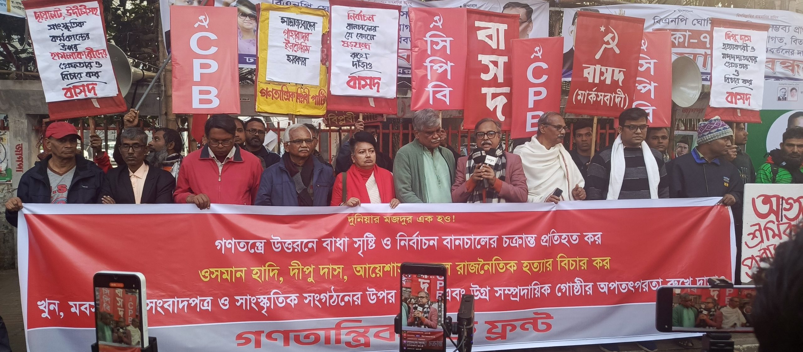 বাম গণতান্ত্রিক জোটের সমন্বয়ক ও বাসদের সাধারণ সম্পাদক কমরেড বজলুর রশীদ ফিরোজের সভাপতিত্বে অনুষ্ঠিত সমাবেশে বক্তব্য রাখেন সিপিবির সভাপতি সাজ্জাদ জহির চন্দন, বাংলাদেশ জাসদের স্হায়ী কমিটির সদস্য ডা. মুশতাক হোসেন, বাসদ (মার্কসবাদী) সমন্বয়ক মাসুদ রানা। সমাবেশে উপস্হিত ছিলেন বিপ্লবী কমিউনিস্ট লীগের সাধারণ সম্পাদক ইকবাল কবীর জাহিদ, গণতান্ত্রিক বিপ্লবী পার্টির সাধারণ সম্পাদক মোশরেফা মিশু, সমাজতান্ত্রিক পার্টির আব্দুল আলী। সমাবেশে বক্তারা বলেন, আগামী জাতীয় সংসদ নির্বাচন বানচাল করার জন্য ঢাকা-৮ আসনের সম্ভাব্য প্রার্থী ও ইনকিলাব মঞ্চের আহ্বায়ক ওসমান হাদিকে সুপরিকল্পিতভাবে হত্যা করা হয়েছে। সরকার তৎক্ষনাৎ রেড এলার্ট জারি না করে হত্যাকারীদের পালিয়ে যেতে সহযোগিতা করেছে। এরপর সরকারের নিষ্ক্রিয়তার সুযোগ নিয়ে একদল উগ্রবাদী প্রথম আলো, ডেইলি স্টার, ছায়ানট, উদীচী কার্যালয় ধ্বংস, দেশের বিভিন্ন স্থানে ভাঙচুর, অগ্নিসংযোগ করেছে বাধাহীনভাবে। একই সময়ে আমরা দেখলাম কথিত ধর্ম অবমাননার অভিযোগ তুলে ভালুকায় গার্মেন্টস শ্রমিক দীপু চন্দ্র দাস নামে এক যুবককে প্রথমে গণপিটুনি তারপর জ্যান্ত পুড়িয়ে মারা হলো। পুলিশ পুরোটা সময় নিশ্চুপ দর্শকের ভূমিকা পালন করলো। লক্ষ্মীপুরে ঘরে আগুন দিয়ে শিশু আয়েশাকে হত্যা করা হলো। সারাদেশে প্রায় প্রতিদিন হত্যা, খুন হামলার ঘটনা ঘটছে। সারাদেশে এই অরাজকতার দায় সরকারকেই নিতে হবে। সরকার শুরু থেকে আইন মানুষের হাতে তুলে নেয়া, মব সন্ত্রাসকে প্রশ্রয় দিয়ে আসছে। এর ফলে জনগণ আজ চরম নিরাপত্তাহীনতায় ভুগছে। এমন পরিস্থিতিতে ঘোলা পানিতে মাছ শিকারের মত অরাজক পরিস্থিতি তৈরি করে নির্বাচন বানচালের চেষ্টা করার জন্য এসব ঘটনা ঘটানো হচ্ছে বলে বক্তারা উদ্বেগ প্রকাশ করেন। বক্তারা এসব কর্মকাণ্ডের সাথে উগ্র ধর্মান্ধ সাম্প্রদায়িক মৌলবাদী গোষ্ঠীর যুক্ত থাকার সম্ভাবনার কথা বলেন। সরকারি ইন্ধন ছাড়া এসব খুন-সন্ত্রাস-হামলা করে পার পেয়ে যাওয়া সম্ভব নয়।
